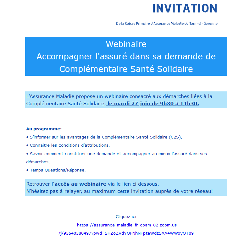Erratum - webinaire Complémentaire Santé Solidaire - C2S Jun 22, 2023, 11:49 am par Sandrine DA MAL... Le webinaire aura lieu le mardi 27 juin de 9h30 à 11h30 Télécharger le fichier (50.45 Ko) Publié par Sandrine DA MAL... le Jun 22, 2023, 11:49 am